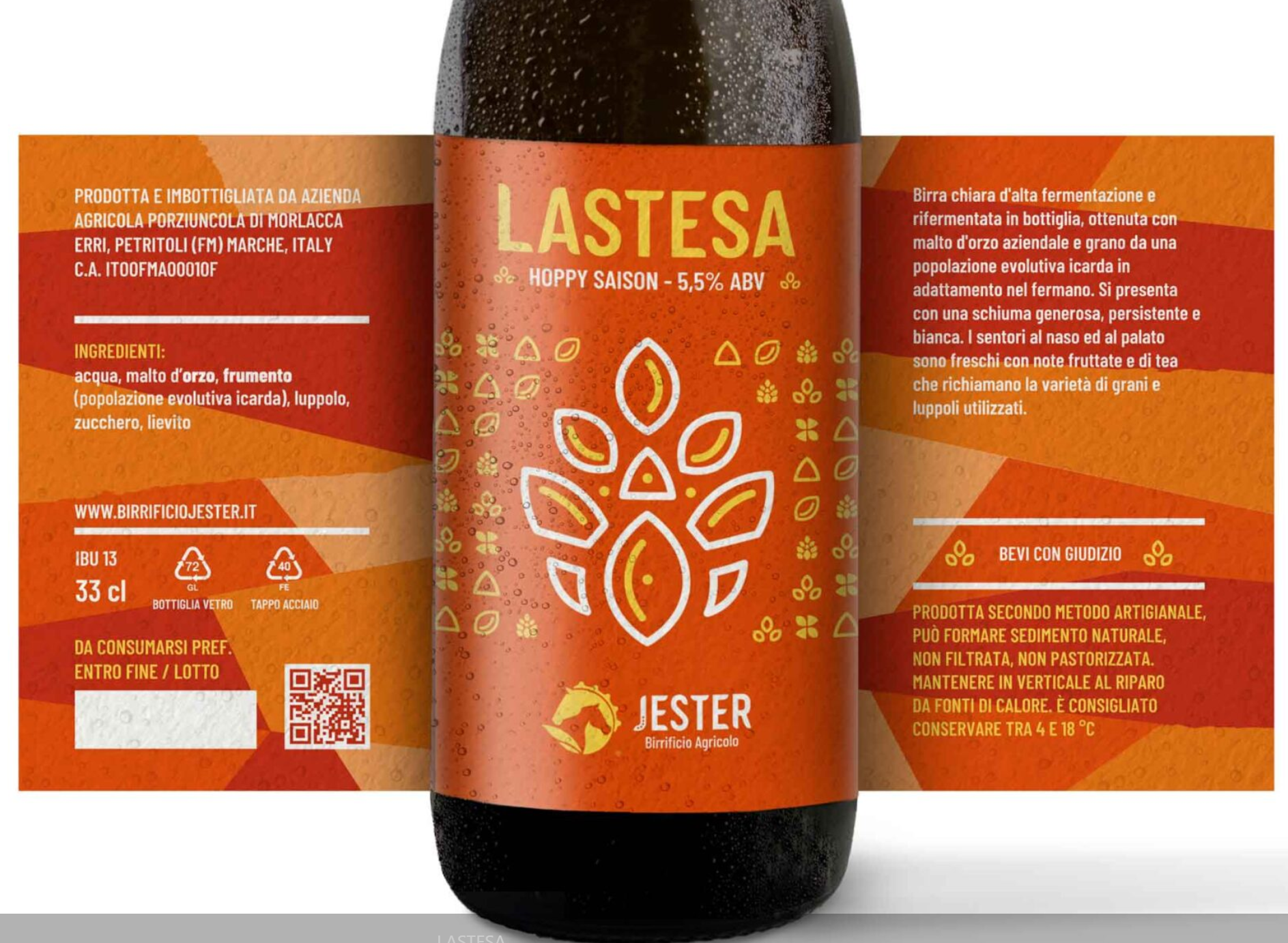 Questa birra saison artigianale italiana, la Lastesa è una birra artigianale in stile Hoppy Saison, ispirata alla tradizione belga ma reinterpretata in chiave italiana dal Birrificio Jester, nelle Marche. È una birra dalla personalità vivace, prodotta con fermentazione alta, rifermentata in bottiglia, non filtrata e non pastorizzata.