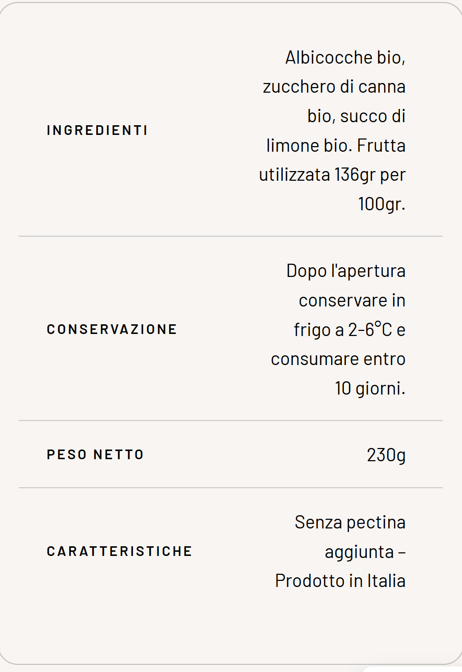 Giร al primo assaggio, la composta di albicocca bio si distingue per la sua intensitร aromatica e la naturale dolcezza della frutta, bilanciata da una piacevole nota acidula che ne esalta il carattere. La consistenza รจ vellutata, ma con piccoli pezzi di frutta che confermano la lavorazione casalinga e artigianale. Il profumo รจ ricco e avvolgente, con sentori di albicocca matura e sfumature di agrumi.