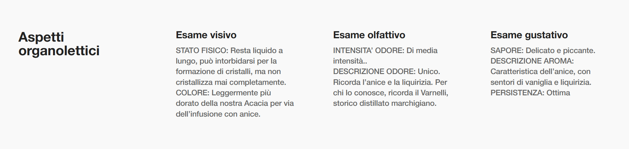 Profumo: dolce e speziato, con note di liquirizia e finocchio