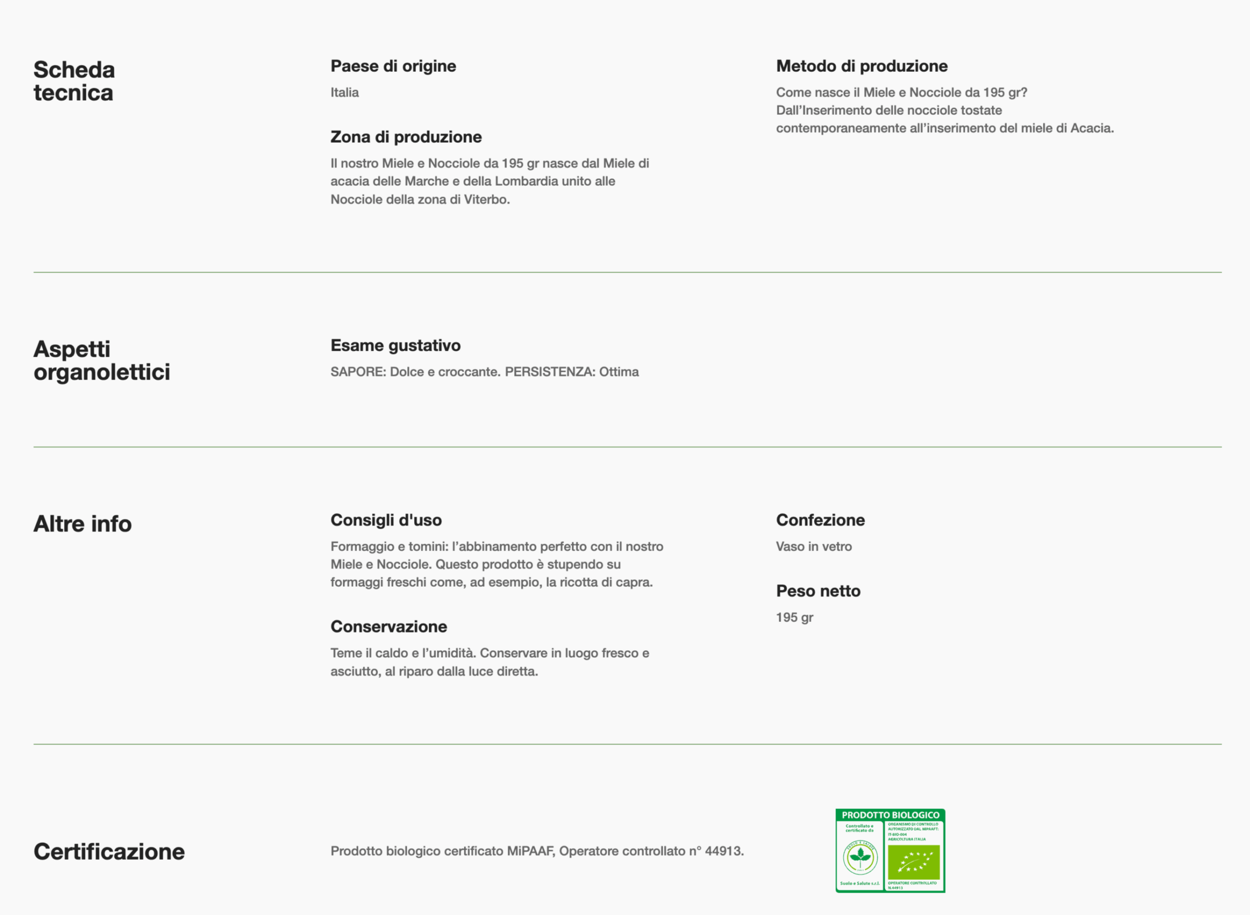 Gusto: il miele avvolge e bilancia il sapore pieno e morbido delle nocciole, creando un mix armonioso e naturale
