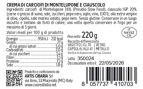 niLa Crema di Carciofini e Ciauscolo Cuore d’Italia nasce dall’incontro tra due prodotti tipici marchigiani: il carciofino di Montelupone e il Ciauscolo IGP, il salame spalmabile più celebre delle Marche. Entrambi vengono lavorati artigianalmente, nel rispetto della tradizione contadina e con ingredienti 100% italiani.