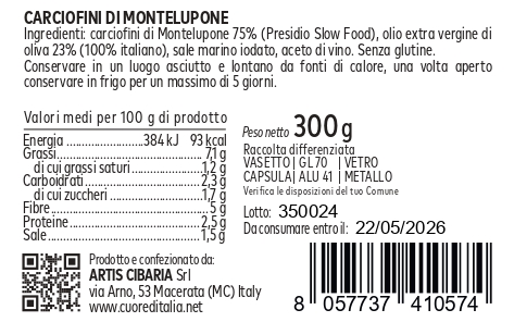 Questo prodotto è 100% italiano, realizzato con carciofi coltivati localmente e con lavorazione artigianale. Ideale per chi cerca sapori veri, etici e legati al territorio. Il vasetto è in vetro, riciclabile e privo di plastica.