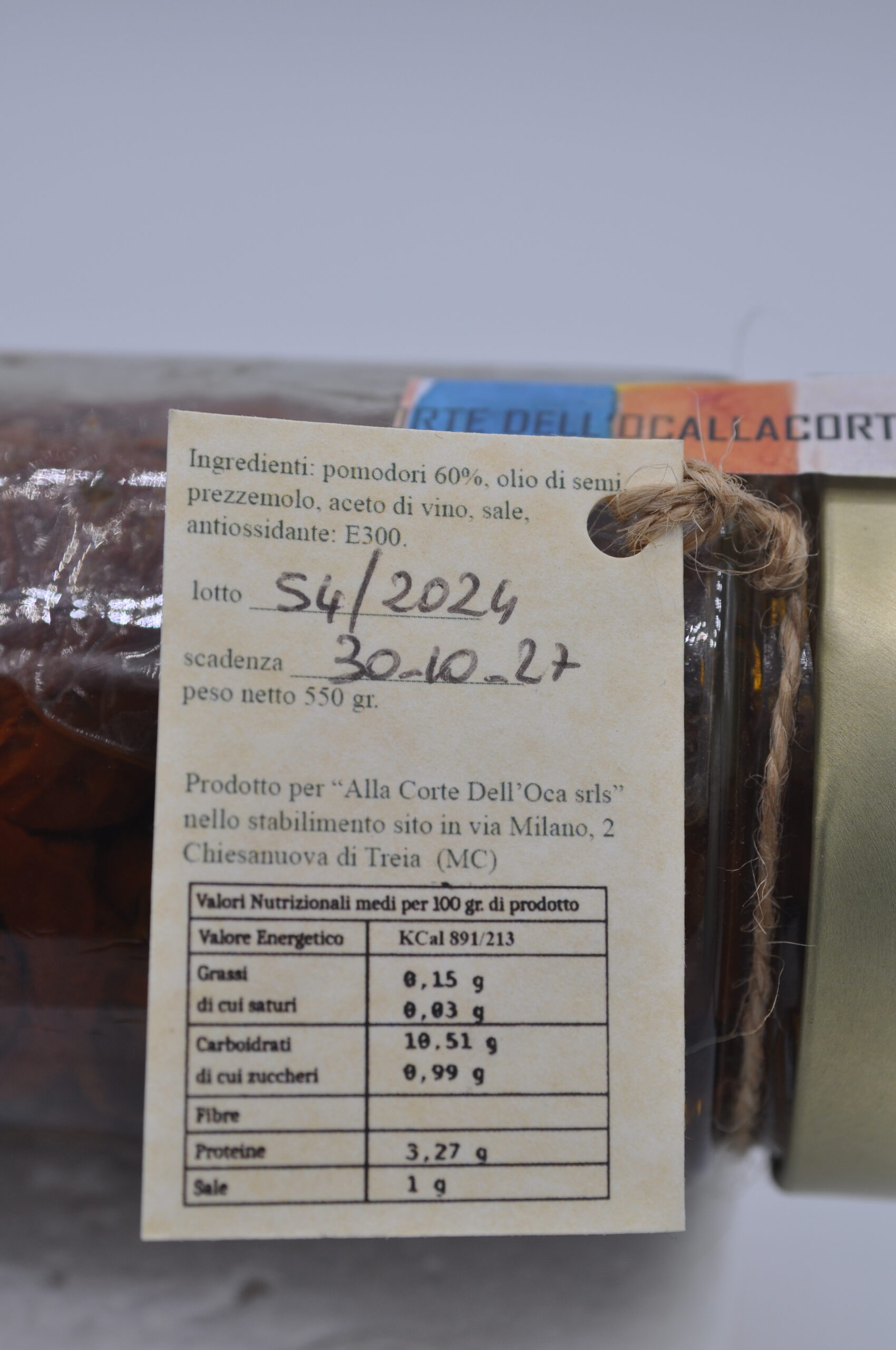 I Pomodori al Sole sott’olio della Corte dell’Oca sono realizzati con pomodori italiani selezionati, lasciati essiccare lentamente al sole per preservarne la dolcezza naturale e il gusto intenso. Questa lavorazione tradizionale, rispettosa dei tempi e delle materie prime, esalta lโaroma pieno e autentico del pomodoro maturo. Ogni pomodoro viene scelto con cura per garantire la massima qualitร e un sapore che ricorda la genuinitร dei prodotti fatti in casa.