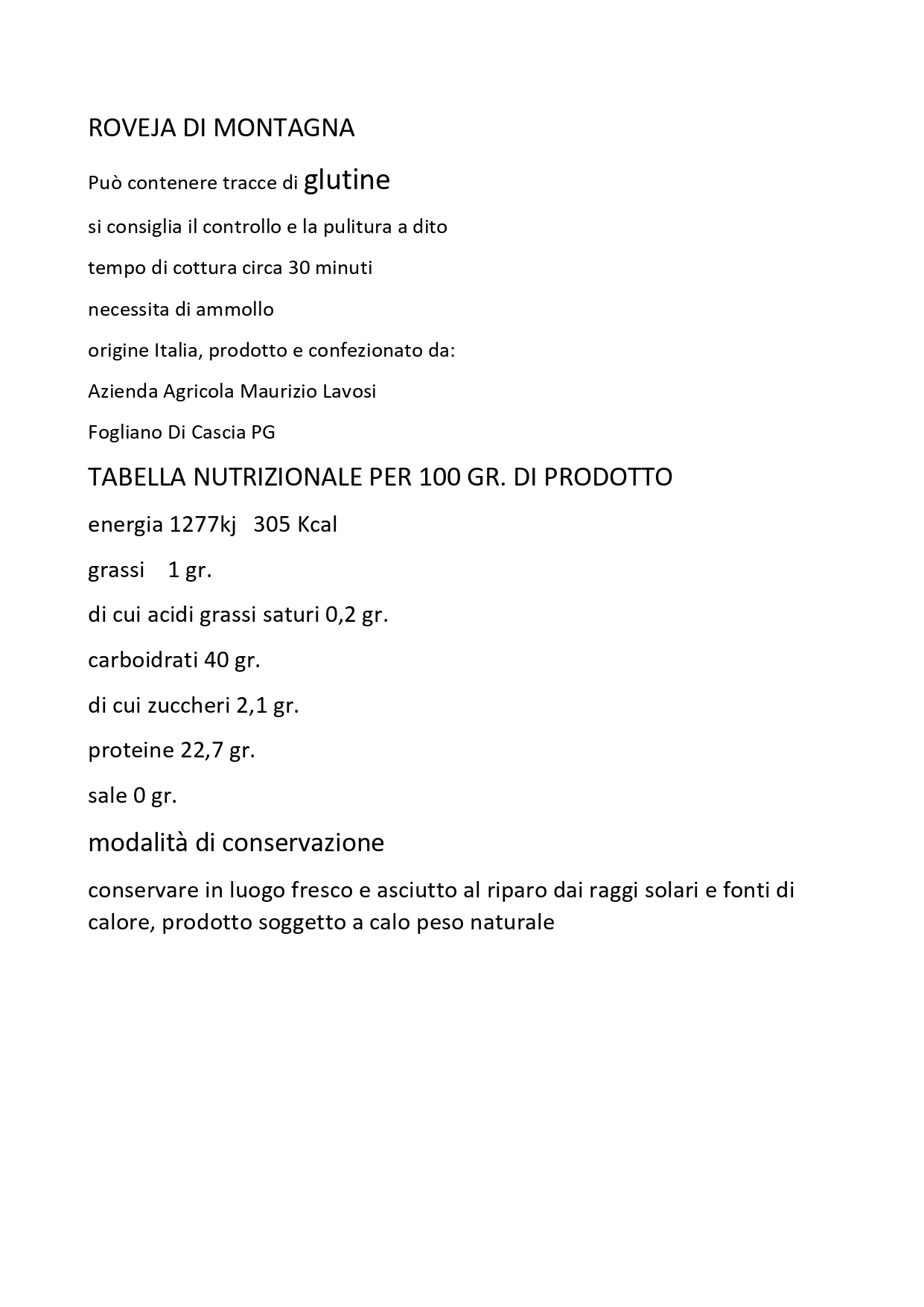 Calorie: Kcal 326 / kJ 1387 Proteine: 24,2 g Carboidrati: 46,5 g di cui zuccheri: 6 g Grassi: 1,4 g di cui saturi: 0,4 g Fibra Alimentare: 16,7 g Sale*: 0,05 g * Il contenuto di sale รจ dovuto esclusivamente al sodio naturalmente presente nel legume.