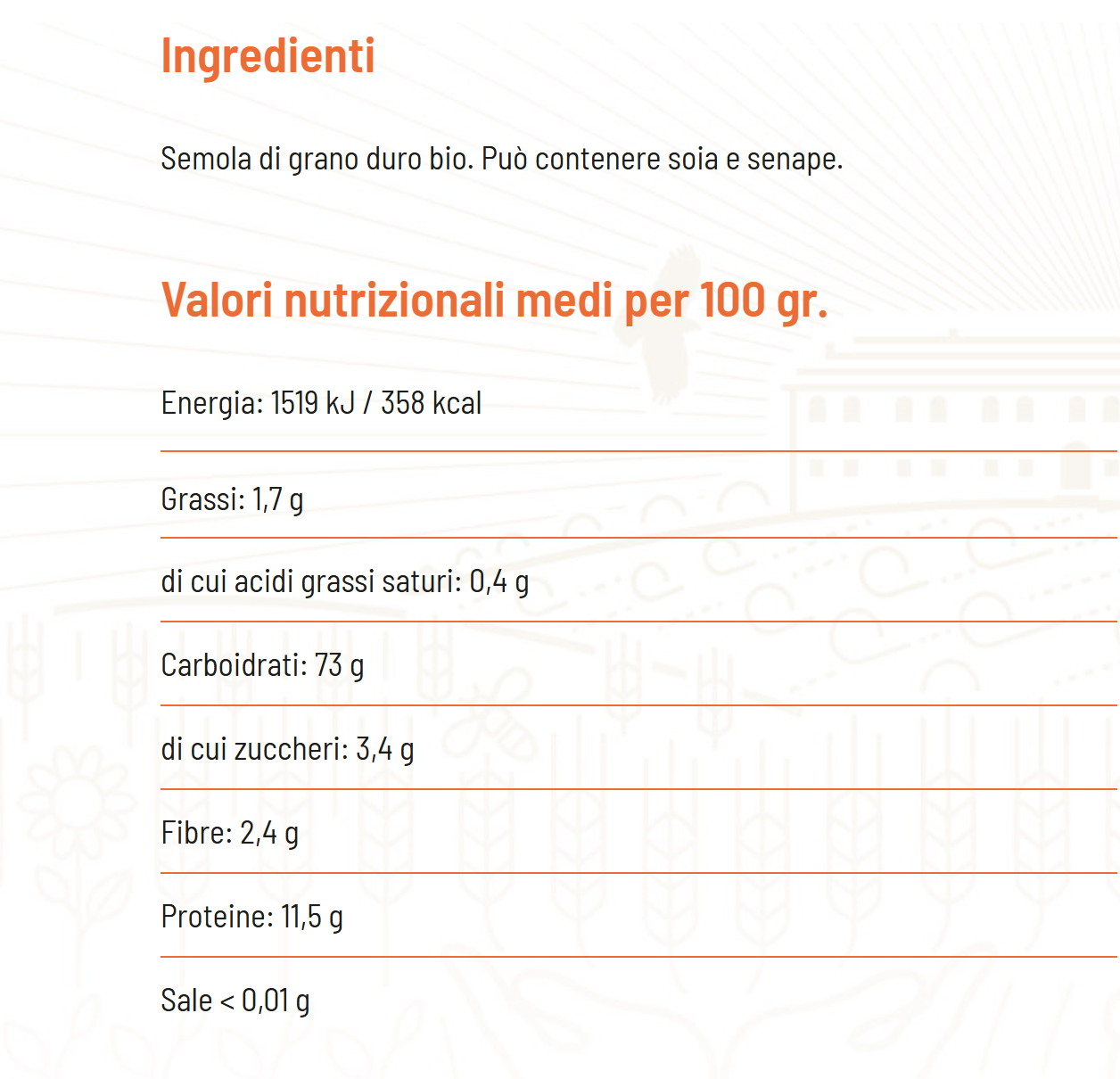 Grazie alla trafilatura al bronzo e alla lenta essiccazione a bassa temperatura, la pasta mantiene intatte le qualità nutrizionali del chicco completo e una struttura ideale per trattenere i condimenti.