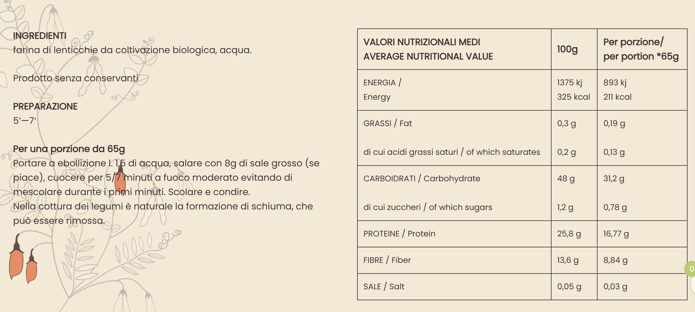 La pasta viene trafilata al bronzo a bassa pressione ed essiccata lentamente a bassa temperatura per conservare tutte le caratteristiche del legume.
