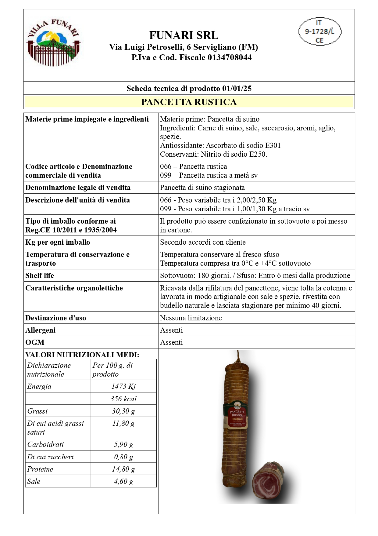 La Pancetta rustica Villa Funari รจ un prodotto che si distingue dalla classica pancetta arrotolata del centro-sud Italia. La forma tesa รจ tipica delle regioni del nord, ma la lavorazione rimane fedele alla tradizione artigianale. Il risultato รจ una pancetta dal sapore pieno, autentico e ricca di profumi, perfetta per chi ama i salumi lavorati con cura.